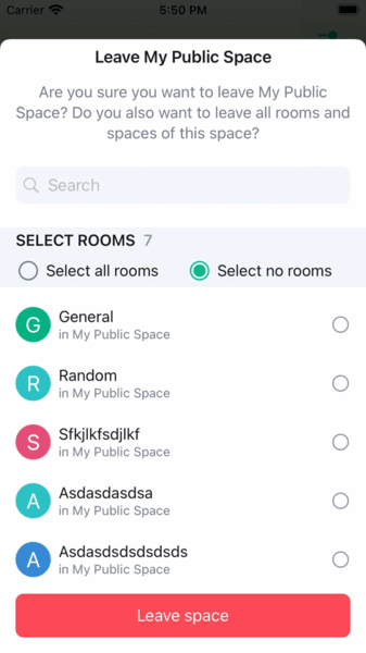 The leaving space experience is now in line with web: you can leave all rooms, none of the rooms or only selected ones