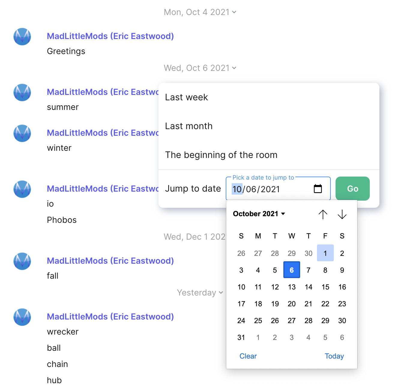 If you've ever tried to find a message back in the past, you've experienced the burdensome task of having to scroll back manually for days, even months! With the jump to date headers, that will be a thing of the past π. Clicking any date separator in the room timeline, will give shortcuts to jump to last week, last month, jump to any date using the date picker, or even the beginning of the room to follow a room upgrade chain.
