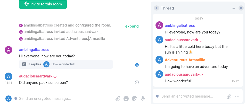 Message threading is coming to Element! If you havenβt yet, head to develop.element.io and ensure βEnable threadingβ is turned on in Labs to test on the web.