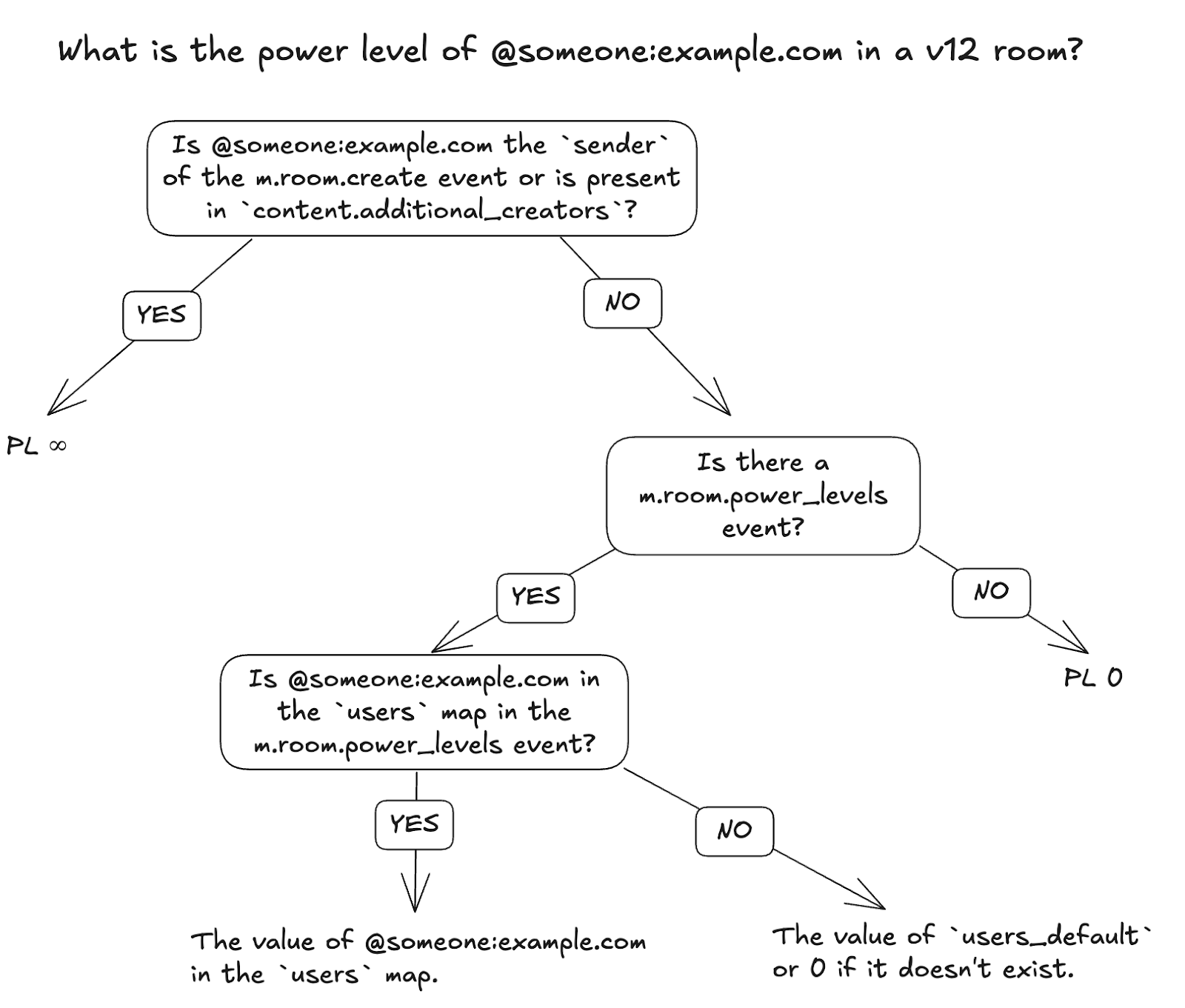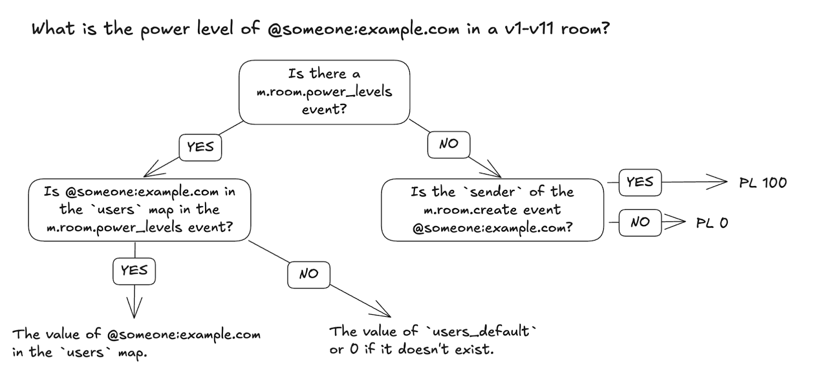 event, many clients failed to implement first branching “no” in v1-v11 rooms. The new rules take into account the privileged position of room creators whilst also ensuring that clients implement the full decision flow chart.